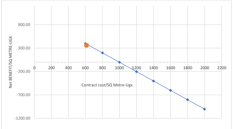 Fig. (2) presents the quality-adjusted net total cost of outsourcing at different values of the outsourcing contract per square meter cleaned. Through outsourcing, the hospital pays UGX 644.35 (USD$ 0.25) per square meter per year for the cleaning services. The vertical line demonstrates that holding all other assumptions constant, outsourcing is cost-beneficial to the hospital management only when the annual unit cost of the outsourcing contract is less than approximately UGX 1000 ($ 0.38) per square meter per year.
